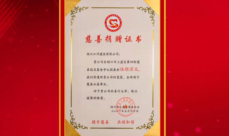 近年來,在企業發展的同時積極回報社會,先后出資1000余萬元設立江河百姓好事基金、江河水利關愛基金、紹興市上虞區慈善總會的慈善冠名基金,用于資助教育、孤寡老人、困難群體等,獎勵百姓身邊的好人好事,主動承擔社會責任。