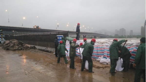 2015年7月11日上午,受超強臺風“燦鴻”影響,曹娥江水位開始上漲,公司防臺指揮部通知各工程項目部,按防汛預案,落實防臺抗洪措施。曹娥江省管海塘曹娥石塘段加固工程項目部調集搶險人員,對堤頂面的二個施工道路閘口填筑砂包封堵。午后,曹娥江水位快速上漲,到下午3時許,工作面處的曹娥江水位已上漲至7.6m高程,距離閘口底不足2m,且仍以每小時1m的漲速逼近堤頂,現場搶險人力填筑砂包的速度已跟不上水位上漲的速度,錢管局寧紹管理處領導和公司現場防臺指揮部商量后,決定立即加強搶險力量,在洪峰到來前將堰頂筑至11.5m的安全高程。險情迅速報告給公司防臺指揮部,總指揮袁偉忠立即命令公司待命的搶險隊伍趕赴現場搶險,另一搶險隊隊長張洪敏接到命令后,迅速組織人員奔赴曹娥石塘,立即展開搶險工作,配合曹娥石塘項目部的搶險人員共同頂風冒雨連續搶筑5小時,于晚上8時,在洪峰到來前3個多小時,將堰頂筑至11.5m高程,確保圍堰具備抗擊臺風和洪水沖擊能力。