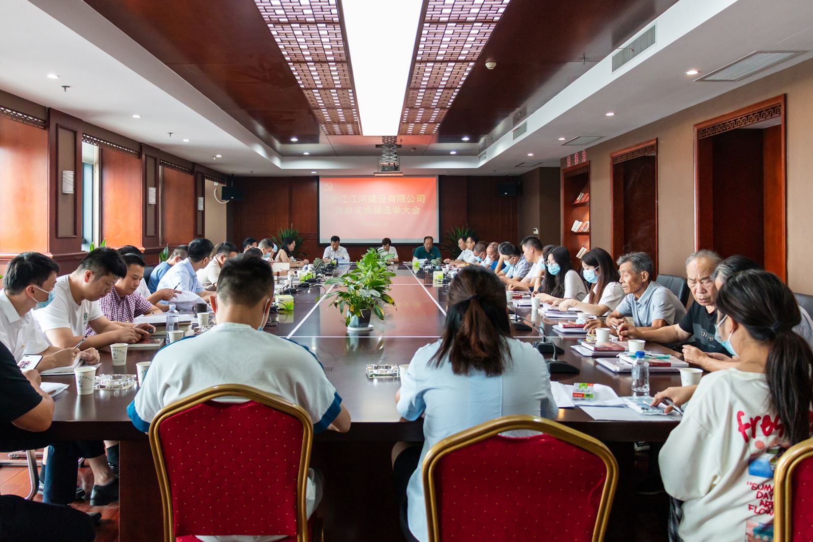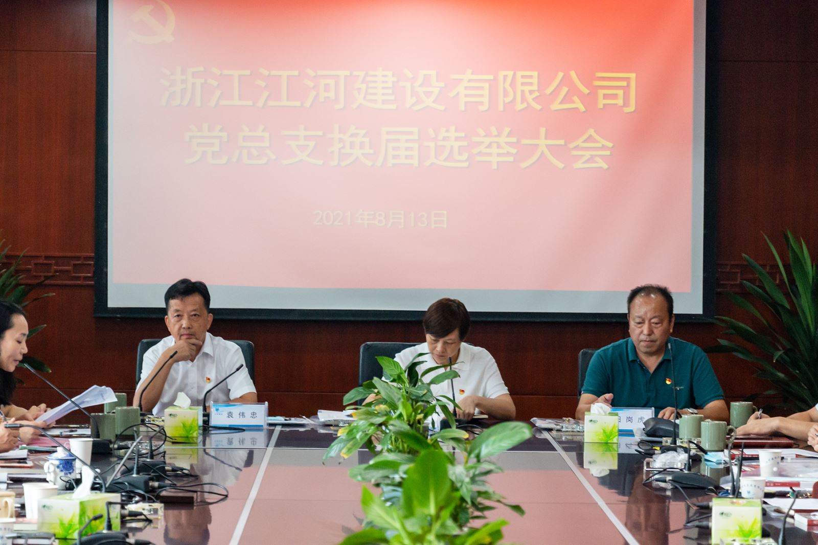 8月13日,浙江江河建設有限公司召開黨總支換屆選舉大會。會議由公司黨總支書記、董事長袁偉忠主持,章鎮鎮黨委副書記陳紅,公司黨建指導員、區水務集團副書記田崗虎出席會議并講話。