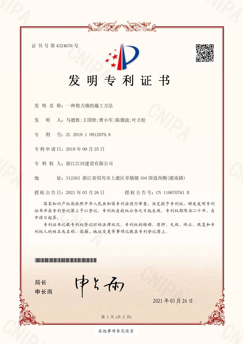 近日,浙江江河建設有限公司再獲兩項由國家知識產權局頒發的發明專利證書,二項發明的名稱為《一種剪力墻的施工方法》和《 一種公路瀝青添加劑及其制備方法 》。