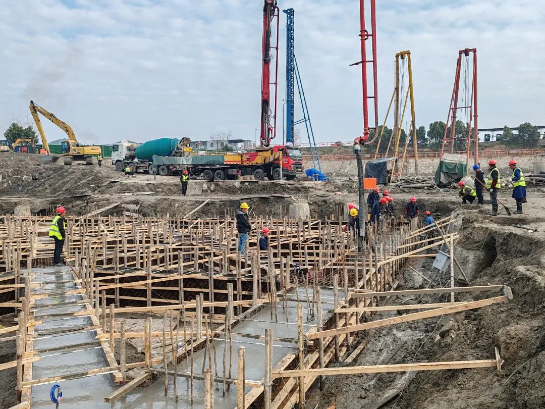 施工過程中,由于基坑處于新近沉積的淤泥質類土層,地下降水緩慢,面對節日將近,工期緊、任務重等困難,項目部加大投入,大量增加降水深井,快速創造干地施工條件,嚴格把控施工各道工序,從測量定位、鋼筋綁扎、模板安裝到混凝土澆筑,每一個環節都嚴格按照規范要求推進,確保施工質量符合設計標準。全體施工人員凝心聚力、全力以赴、日夜奮戰,確保在春節前完成支撐梁澆筑。